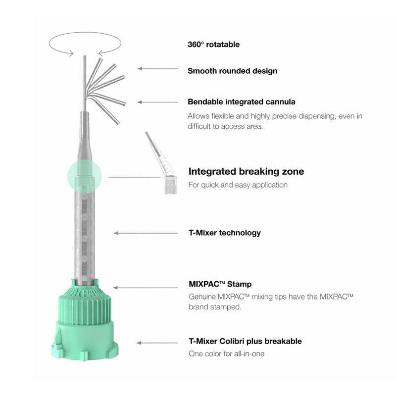 The MIXPAC™ T-Mixer Colibri plus breakable simplifies selection of the mixing tip since it can be used for various materials and clinical applications, e.g. impressions of the root canals, preparations and cavities. The integrated stainless steel cannula, which is bendable and rotatable up to 360°, allows for precise clinical application with a low risk of trauma to soft tissue due to its smooth, rounded design. Its integrated breaking zone located in the anterior part of the mixing tip, can be quickly and easily removed to facilitate application of large amounts of material.